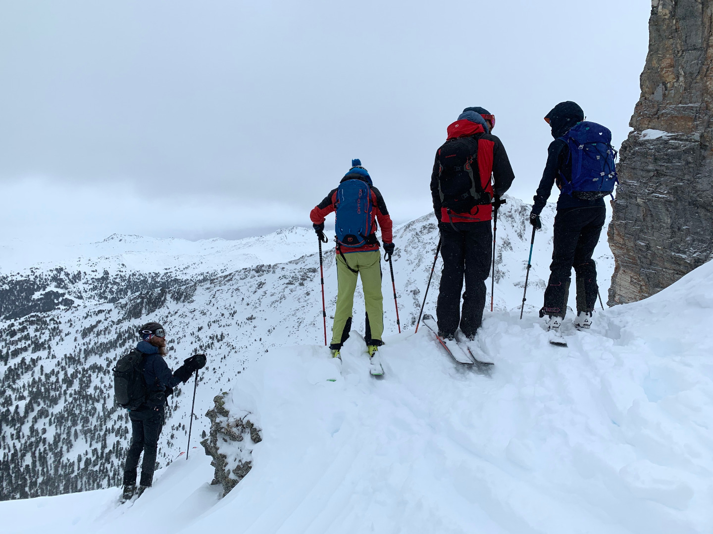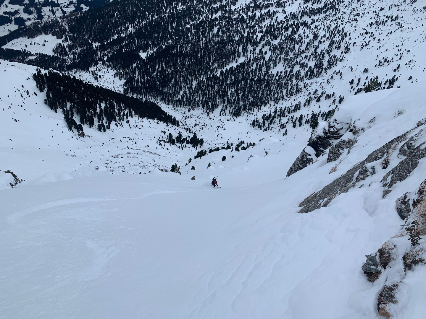 Da der Wetterbericht nichts Gutes zu berichten hatte, war es diesmal angebracht das Hochgebirge zu meiden. Wir starteten am Kolsassberg (Fanghaus) und stiegen über die Studlalm zur Sagspitze auf (erstaunlich, auch von den „alten“ Hasen war noch keiner auf diesem Gipfel). Es folgte die ostseitige Abfahrt in das Becken, welches hier von Sagspitze, Hirzer und Wildofen definiert wird. Von dort ging es über eigentlich wunderschönes Schigelände (wieso fährt man hier nie runter?) in strammem Schritt auf den Wildofen, wo uns der angekündigte Wettersturz in Empfang nahm. Die Abfahrt über die Thagetlahnalm zurück zum Auto war im Mittelteil vergnüglich. Am Forstweg war Defensive die eindeutig bessere Option.