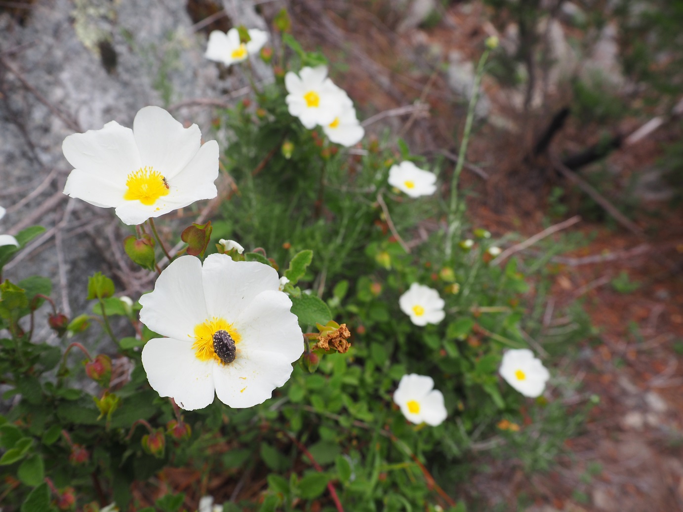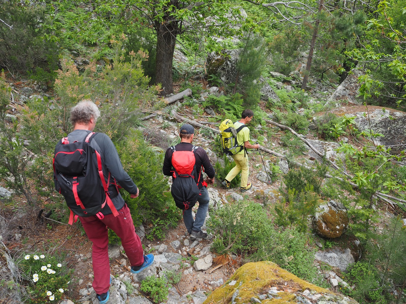 Zunächst besuchten wir den Klettergarten Petre Scritte in der Nähe von Bastia. Der Zustieg ist mit 40 Minuten für einen Klettergarten relativ lange. Dafür wird man mit traumhafter Aussicht, angenehmem Ambiente und perfekt gesicherten steilen und langen Routen“belohnt. Der Andrang war – wie für Korsika fast schon üblich – überschaubar, außer uns war exakt ein kletterndes Paar im Klettergarten.