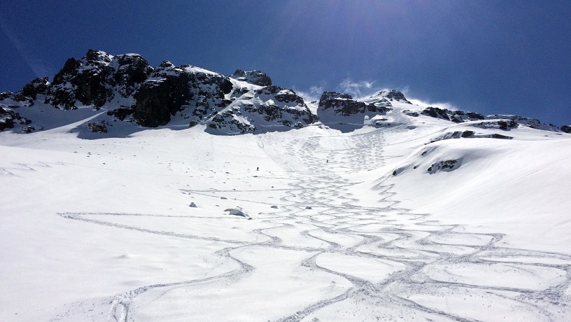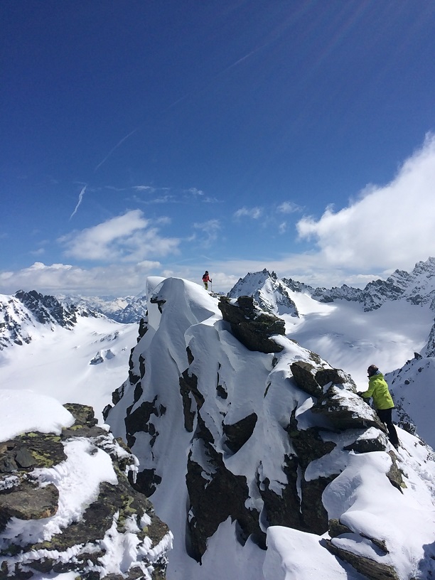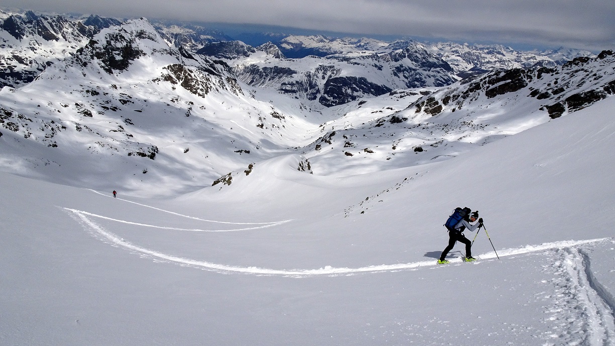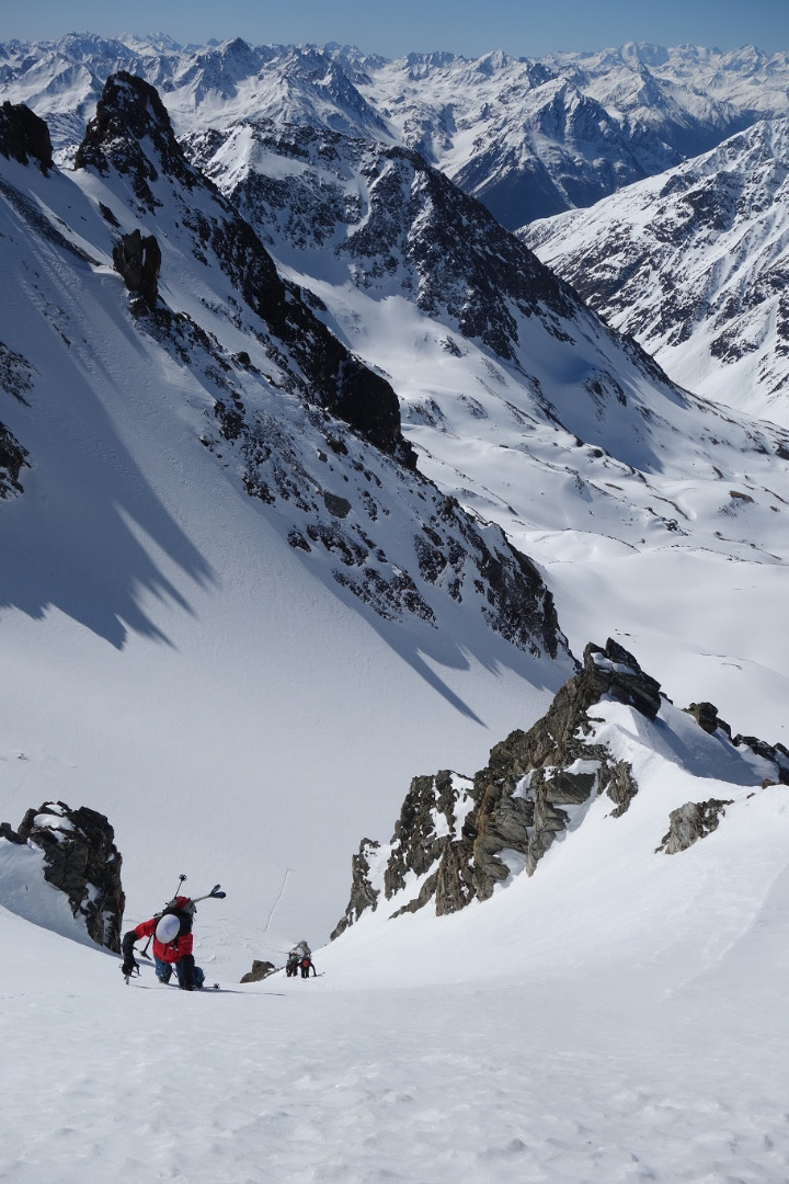 Schwein muss man haben. Pünktlich zum Wochenende zeigte sich das Wetter (und damit auch die Schneeverhältnisse) von der sonnigen Seite. Wir waren uns einig: solche Verhältnisse müssen genutzt werden. Und damit begann die Silvretta-Rallye, die uns über Haagspitze, Rauhen Kopf, Vordere Jamspitze, Hintere Jamspitze, Dreiländerspitze, Silvrettahorn, Schneeglocke und Sattelkopf führte. Zwischendurch gab es ansprechende Rinnenstapfereien, schroffe Gipfel, steile Firnflanken und immer wieder Powdersequenzen.