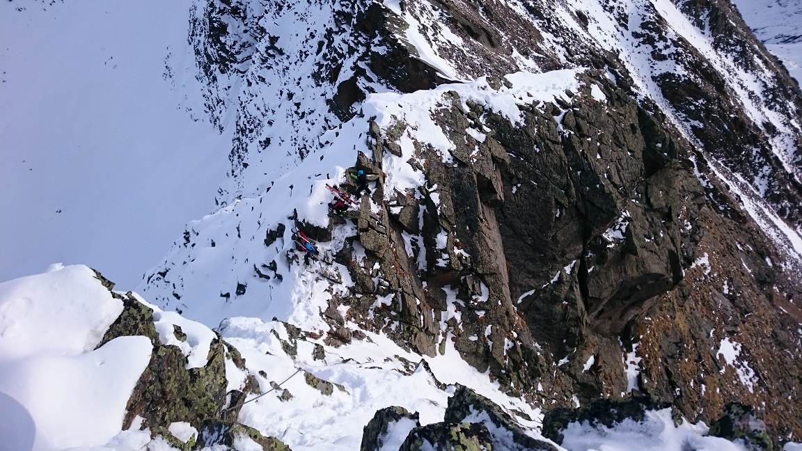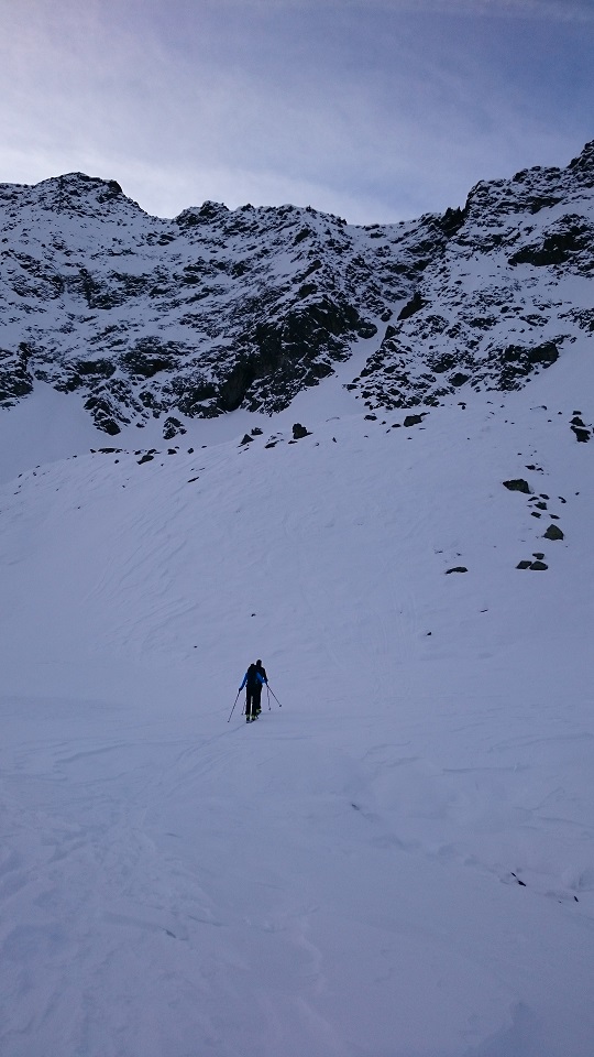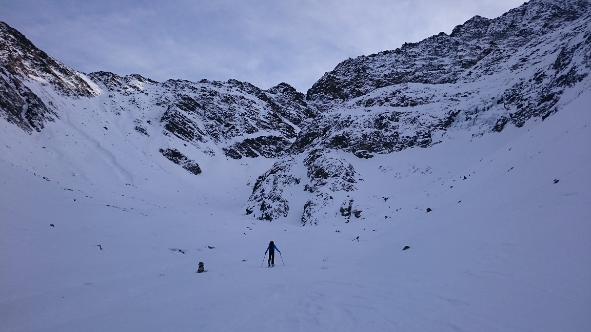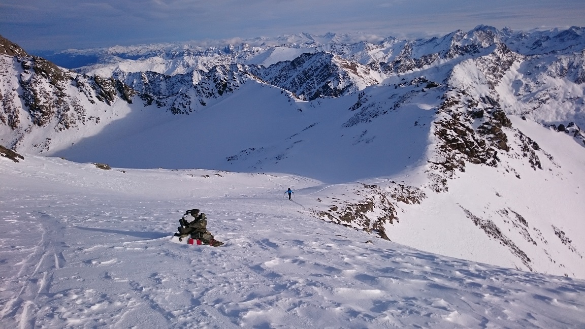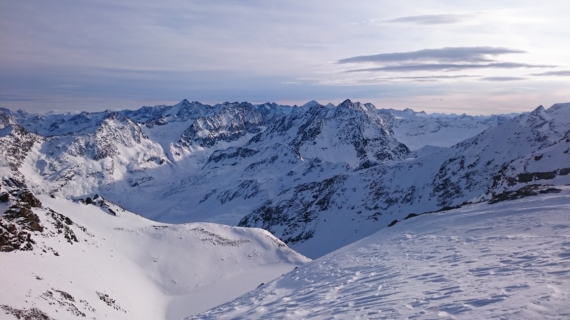 Auf Grund der dürftigen Schneelage ist es derzeit nicht ganz einfach, ein adäquates Schitourenziel zu finden. Sonnseitig sowie unterhalb von 1800m Seehöhe hat man mit Schiern nichts verloren. Deshalb starteten wir im Kühtai und wühlten uns zunächst durch die Nordrinne und den Klettersteig auf den Pockkogel. Sodann Abfahrt durch das Steintal (im unteren Teil Pulverschnee) bis zur Hinterzwing. Felle wieder aufgeklebt und noch zügig hinauf auf den Zwieselbacher Roßkogel, wobei sich die Tourengruppe durch konditionelle und technische Problemchen stetig dezimierte. Abfahrt? Na wer geht schon wegen der Abfahrt auf Schitour? Dabei darf eigentlich nicht gejammert werden. Im oberen Teil Pulver, dann Bruchharsch auf tragfähigem Untergrund (keine Steinkontakte!) und am Weg durch das Kraspestal auf durch Schidoo verdichteter Minimalschneeauflage.