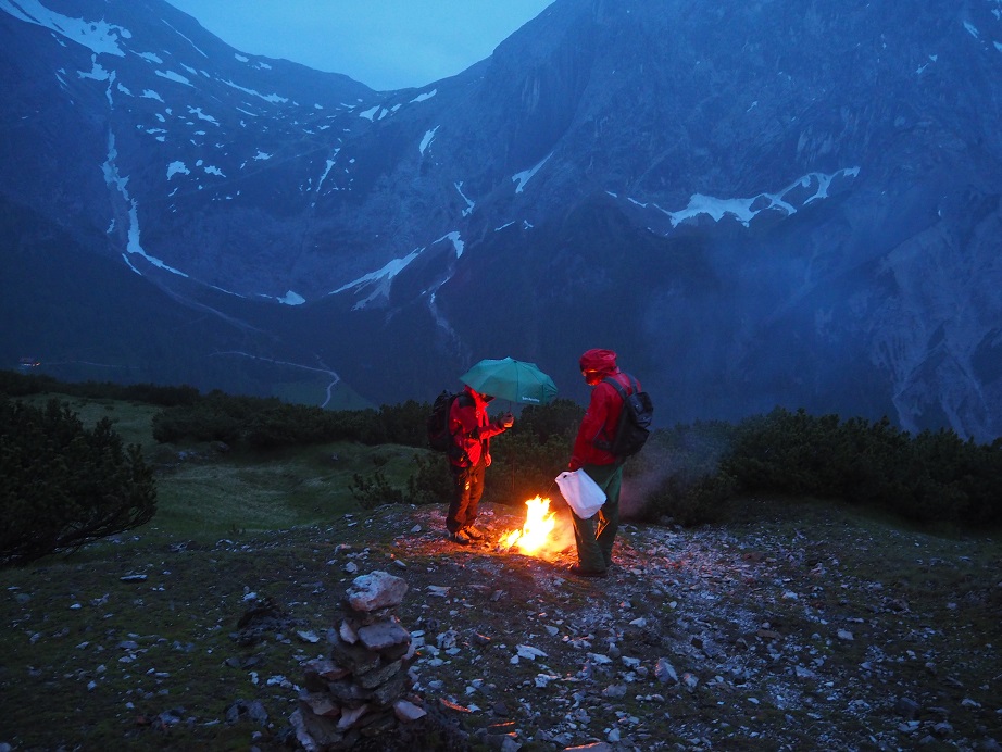 Im Anschluss wanderten wir über das Lafatscherjoch um uns die grauslig nassen Schnitlwände anzusehen. An klettern ist derzeit nicht zu denken. Abendliches Bergfeuer, natürlich im Regen. Alle Steige sind eher Bachläufe.