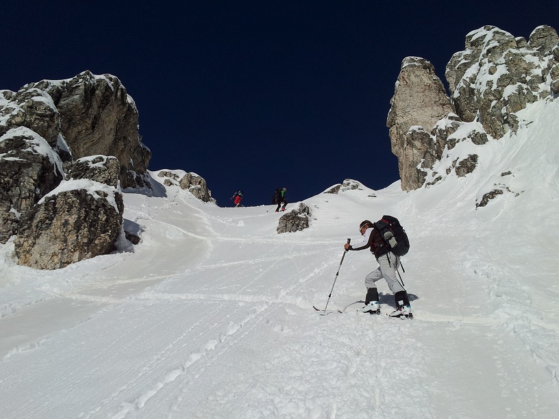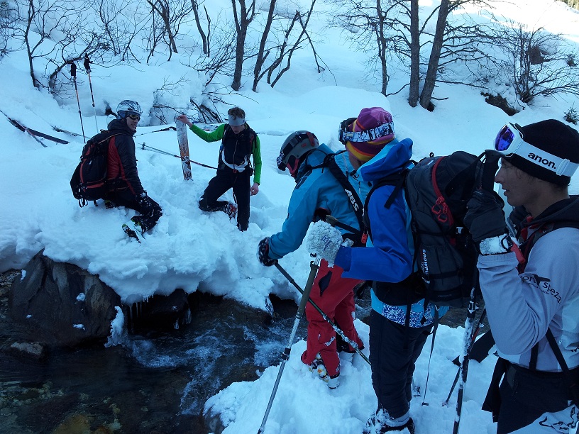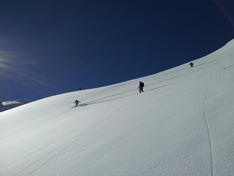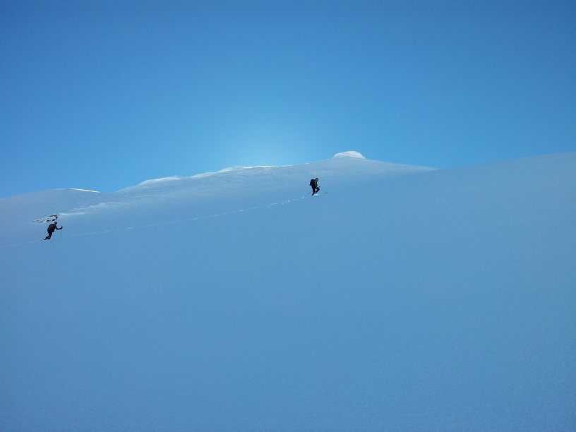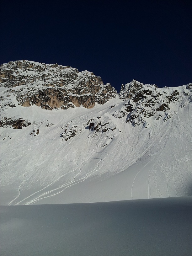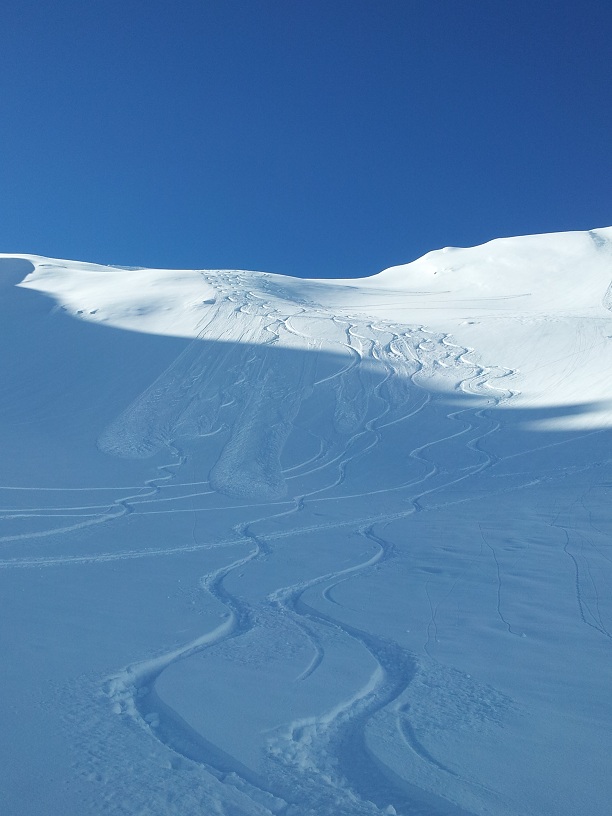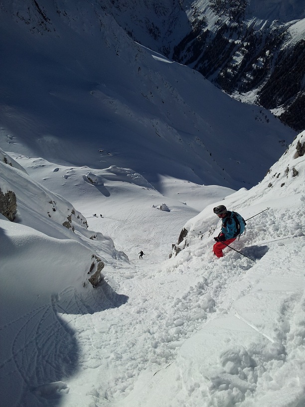 Logisch. Bei dem Wetter und den Verhältnissen ist man auf der Suche nach dem ultimativen Erlebnis. Wir wurden im Gschnitztal fündig. Zunächst auf den Pflerscher Pinggl, dann in allerfeinstem unverspurtem Champagnerpowder hinunter bis Hintersandes. Felle wieder aufgepappt und südseitig (hier hat die Sonne den Schnee bereits geröstet) rauf auf die Gargglerin. Abfahrt direkt vom Gipfel über gewaltige Schattenhänge“der Badl- und Grüblalm zum Gschnitzbach. Dort delikate Bachquerung und zum wohlverdienten TAB (TourenAbschlussBier). 2200 Höhenmeter Fahrvergnügen ohne Schönheitsfehler – ein gelungener Tag mit vielen zufriedenen Gesichtern. mac