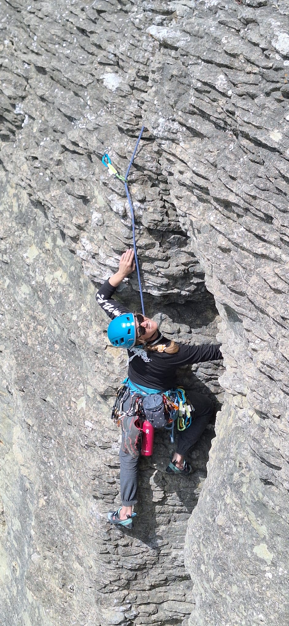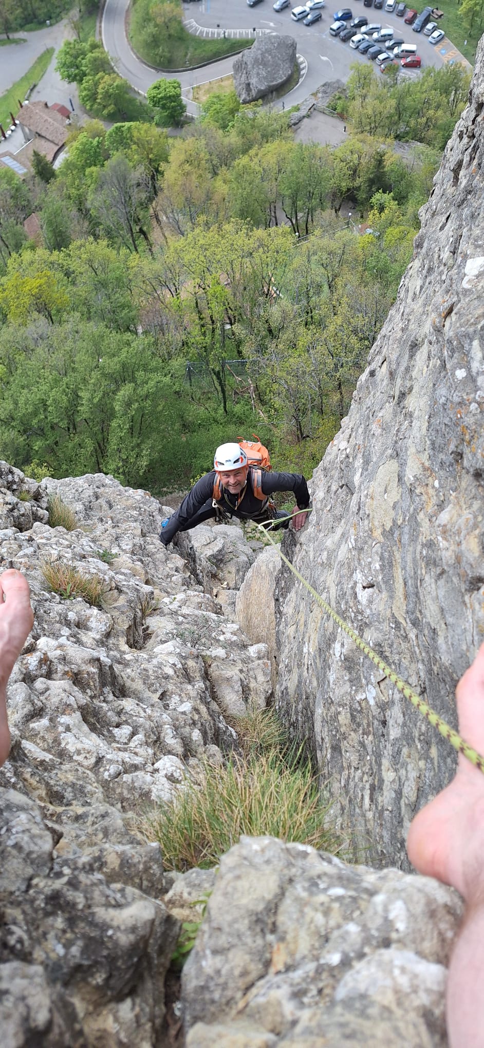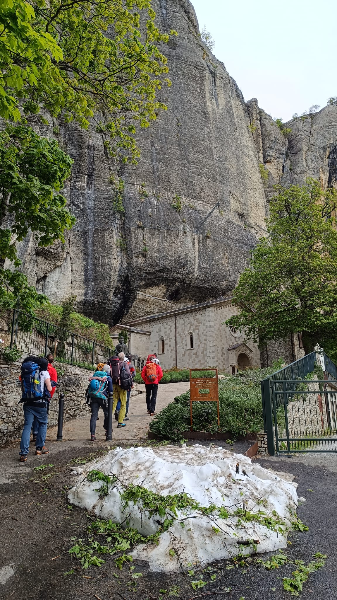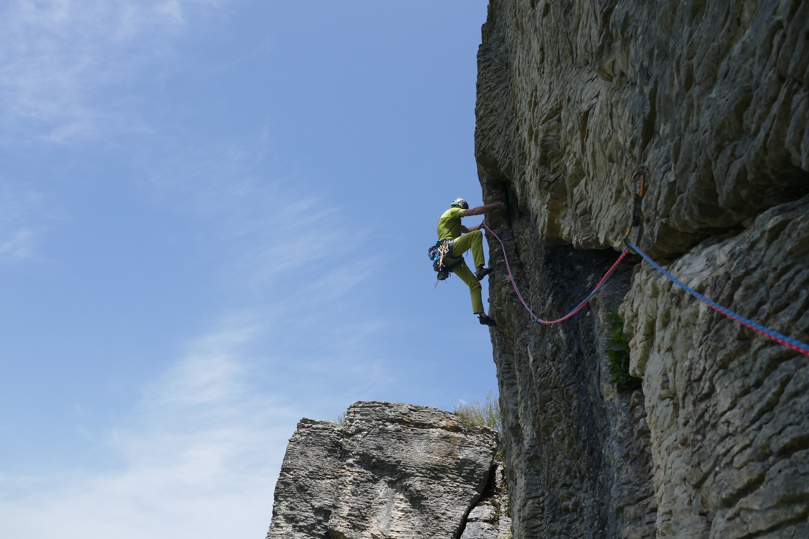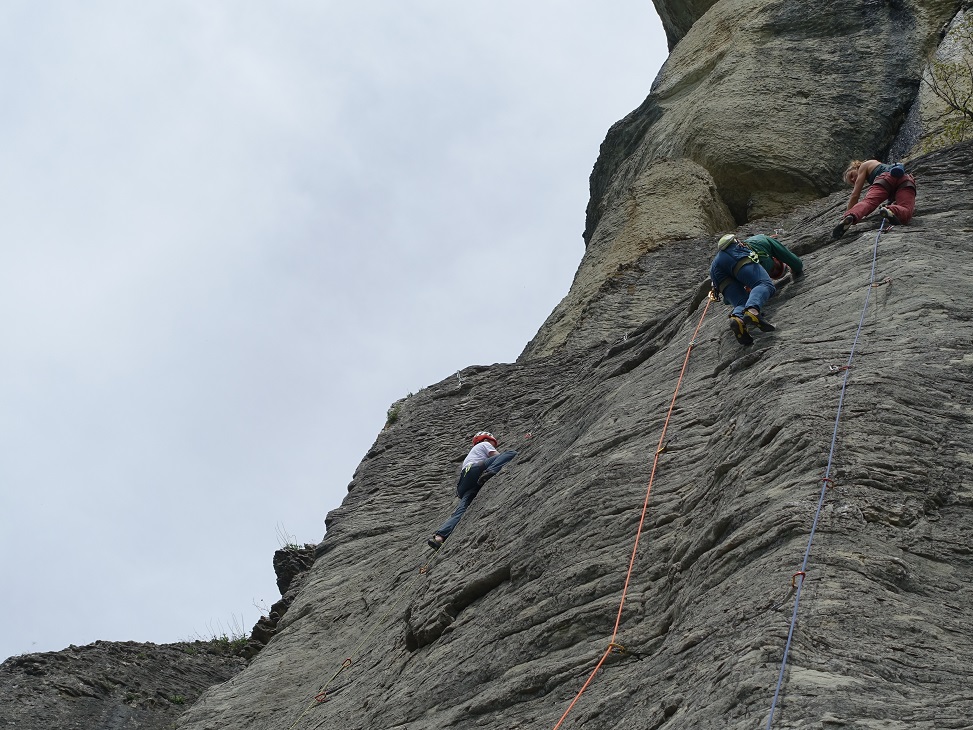 Am Parkplatz der Kletterfelsen in Bismantova empfing uns ein frischer Schneehaufen, Überrest des gerade erst abgezogenen Wettersturzes. Da das Wetter in den ersten Tages unseres Aufenthaltes niederschlagsfrei war, trocknete der Fels rasch ab und bot vergnügliche Klettereien. Lediglich einige Risstouren blieben zu feucht um beklettert zu werden. Die Kletterei ist insgesamt gewöhnungsbedürftig, da schadet es nicht sich erst einmal einzugewöhnen. Da der Hügel extrem steil ist, darf man sich sowohl in den Rissen wie auch auf den Auflegern und sogar den Henkeltrails ordentlich festhalten.