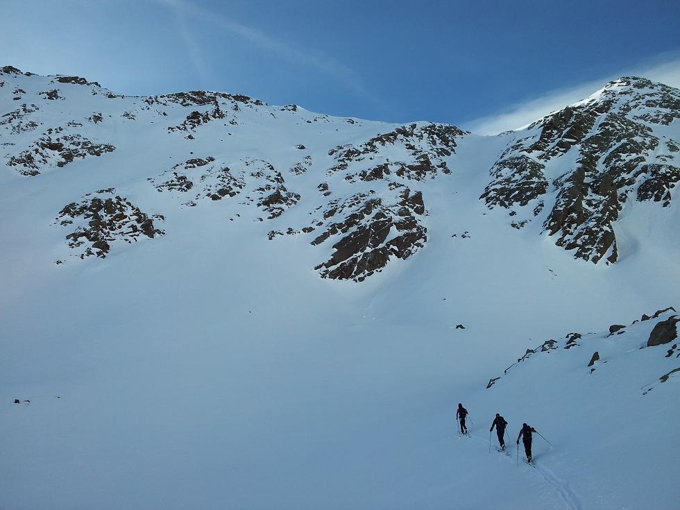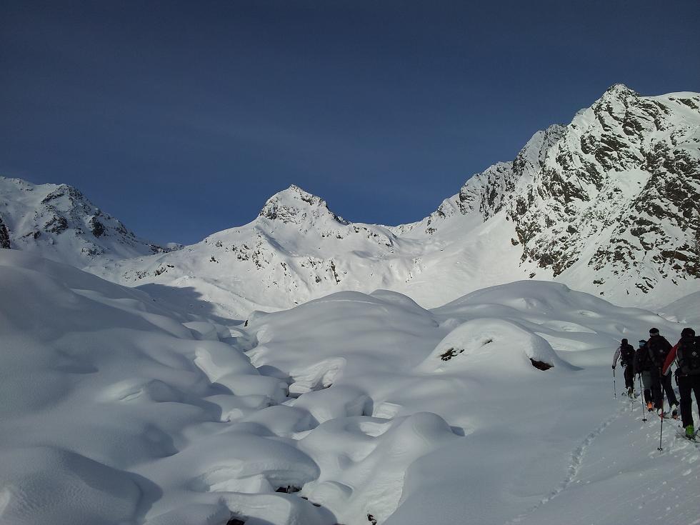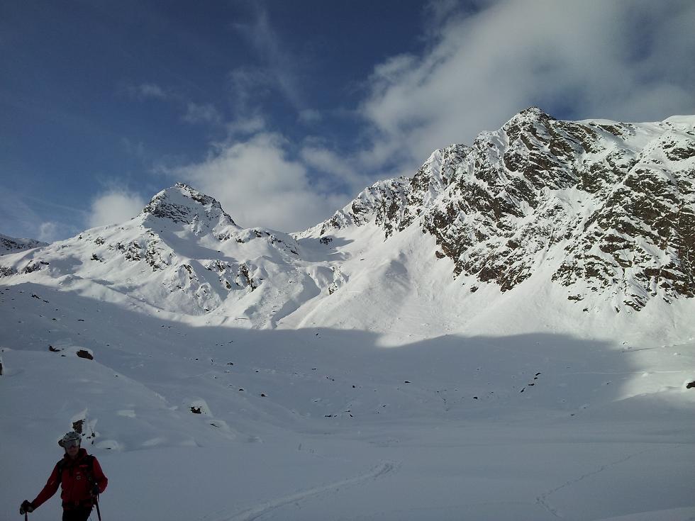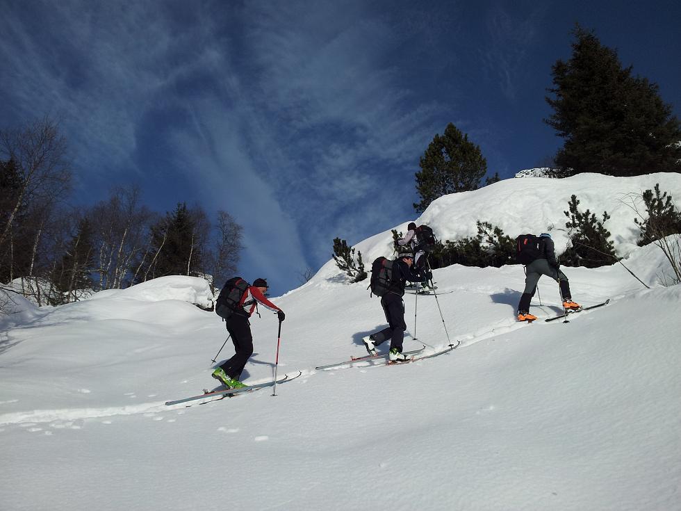 Nach den guten Erfahrungen vom Mittwoch (Habicht bei Pulver), steuerten wir erneut das Gschnitztal an. Wohl wissend, dass südseitige Hänge inzwischen einen Harschdeckel aufweisen, wählten wir ein etwas“sonnenabgewandteres Ziel, die südliche Rötenspitze. Ab der Laponisalm war“Spurarbeit angesagt und bald wurde klar, was der Tourenführer“unter steil und mühsam (bezeiht sich auf die erste Steilstufe vom Talboden auf die Traulalm) versteht. Ab der Alm wählten wir den Weg durch das Bockkar (vielleicht weil wir diesmal eine reine Männerpartie waren!?) der zum Schluss mit einer steilen Rinne aufwartet. Die Abfahrt erfolgte immer über möglichst ostseitige Hänge (noch pulvrig) und“sogar der steile Wald hinunter zur Laponisalm“gab sich zahm. Und wenn niemand die Autobahnausfahrt versäumt hat (gg), sind alle Teilnehmer wieder wohl zu Hause gelandet.