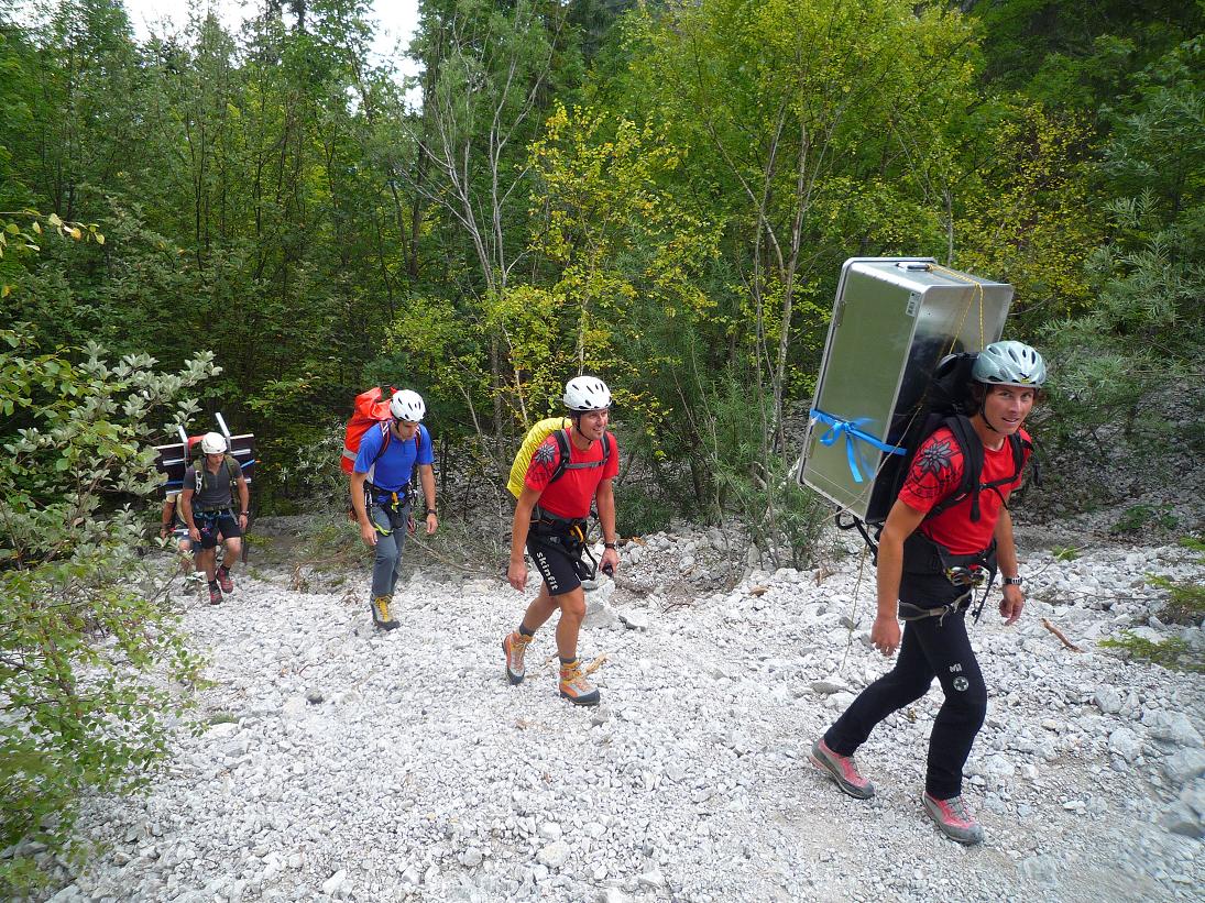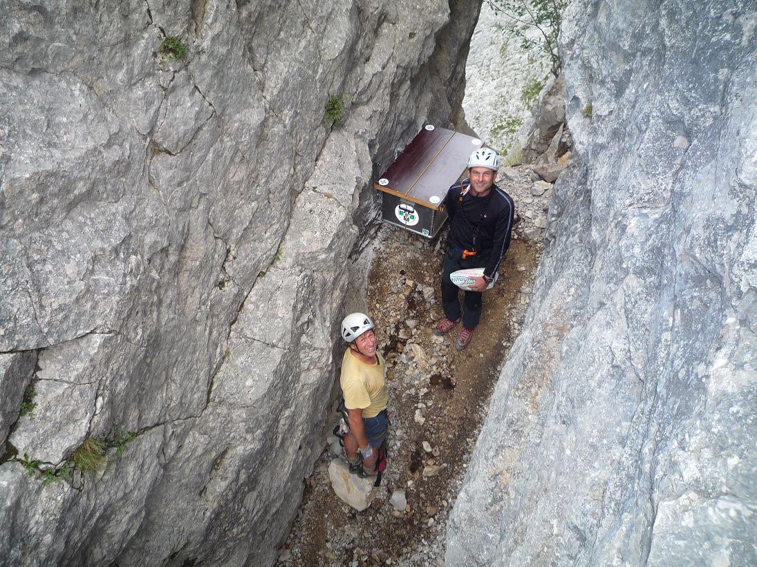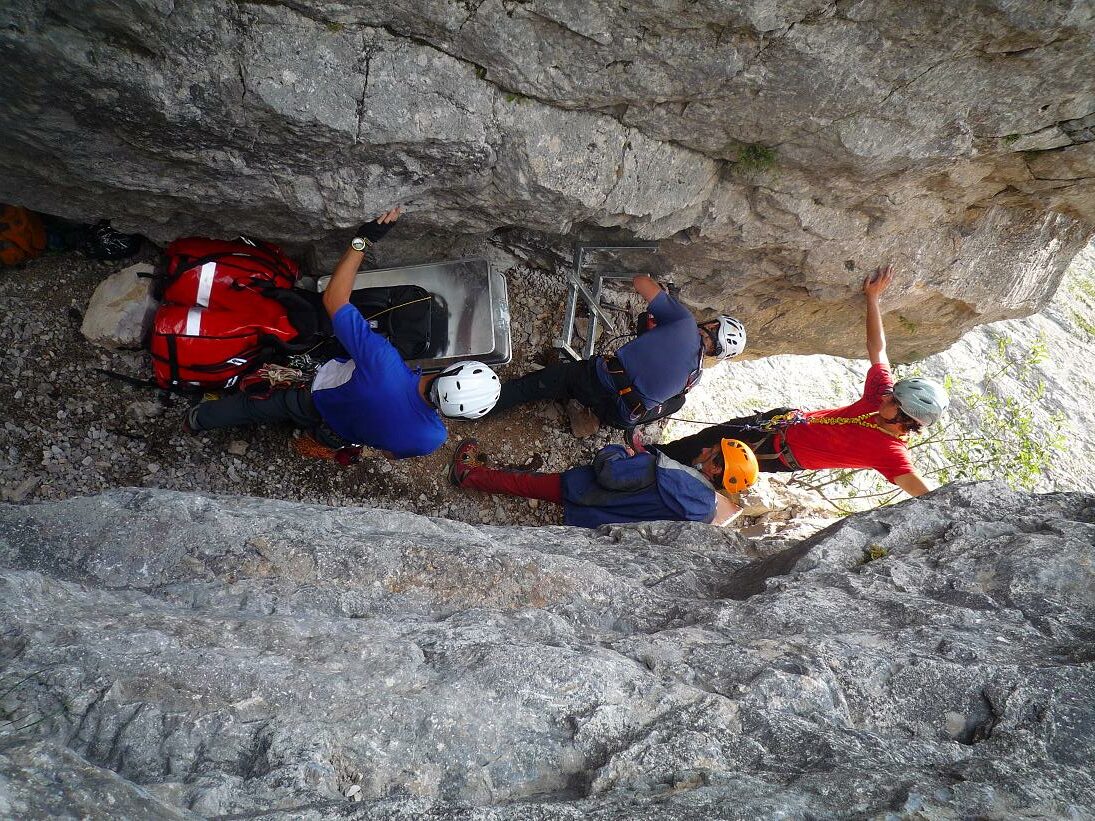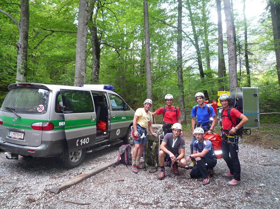 Bereits bei der Erstellung des Sicherheitskonzeptes für den Absamer Klettersteig, wurde die Deponierung von Bergematerial an geeigneter Stelle erwogen, um im Einsatzfall vor Ort rasch über die nötige Ausrüstung verfügen zu können. Die Lagerung des notwendigen Bergematerials an auch bei Dunkelheit und schlechter Sicht gut zugänglicher Stelle sollte helfen, einen allfälligen Bergevorgang zu beschleunigen. Die zahlreichen“Notrufe aus dem Absamer Klettersteig haben die Überlegungen bestätigt, und so wurde nunmehr von der Bergrettung Ortsstelle Hall im Bereich „Turm“ eine Alubox installiert, die alle notwendigen Gerätschaften für eine terrestrische Bergung aus dem Klettersteig beinhaltet. Der eigentliche Bergevorgang, der heuer in einer großangelegten Übung trainiert wurde, stellt mit Sicherheit einen Extremfall für zu bergende Person, Retter und Material dar, zumal eine terrestrische Bergung mit großer Wahrscheinlichkeit bei Nacht bzw. bei schlechter Witterung zu absolvieren sein wird. Bei flugtauglichen äußeren Bedingungen bleibt der Notarzthubschrauber unverzichtbares Glied in der Rettungskette.