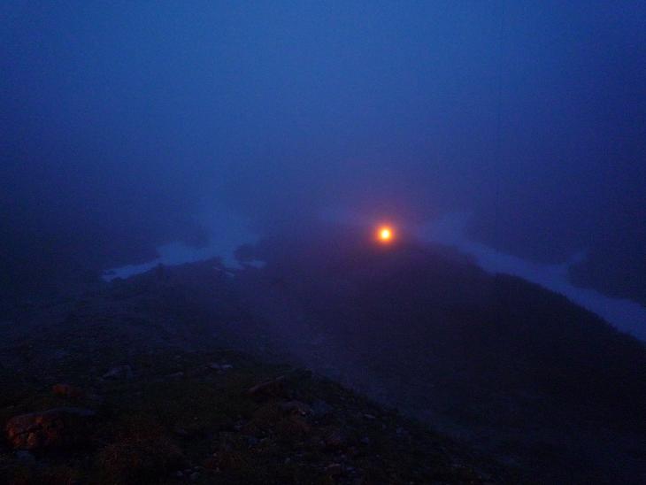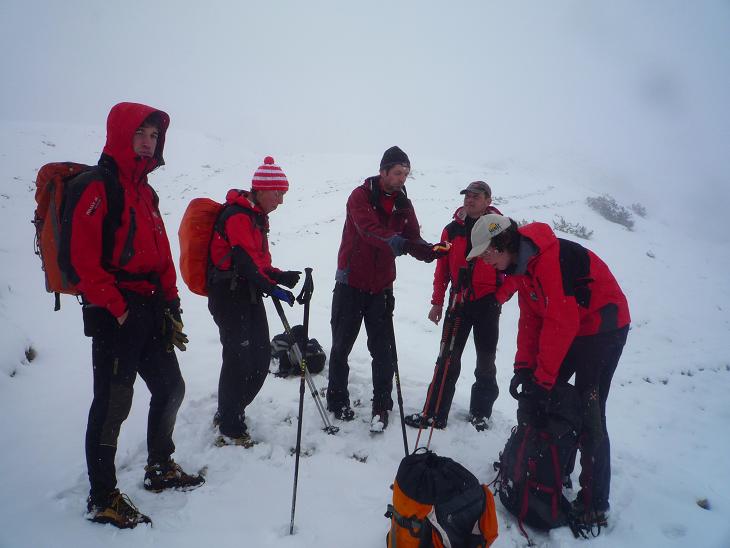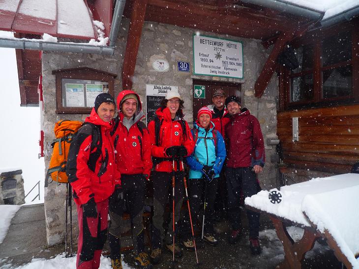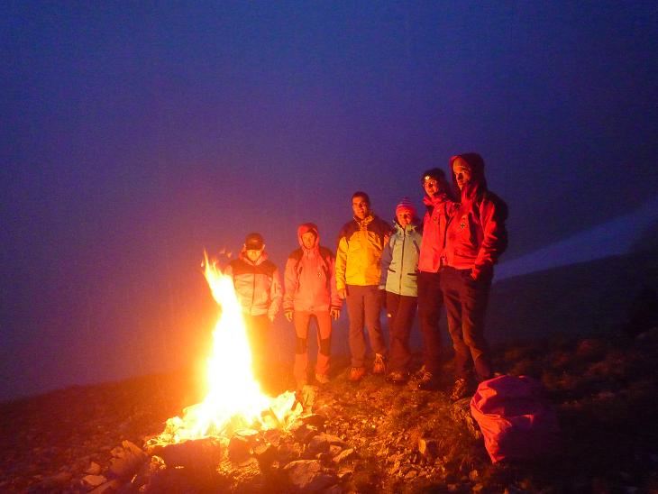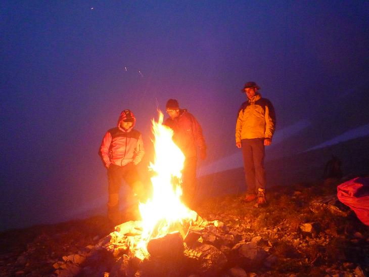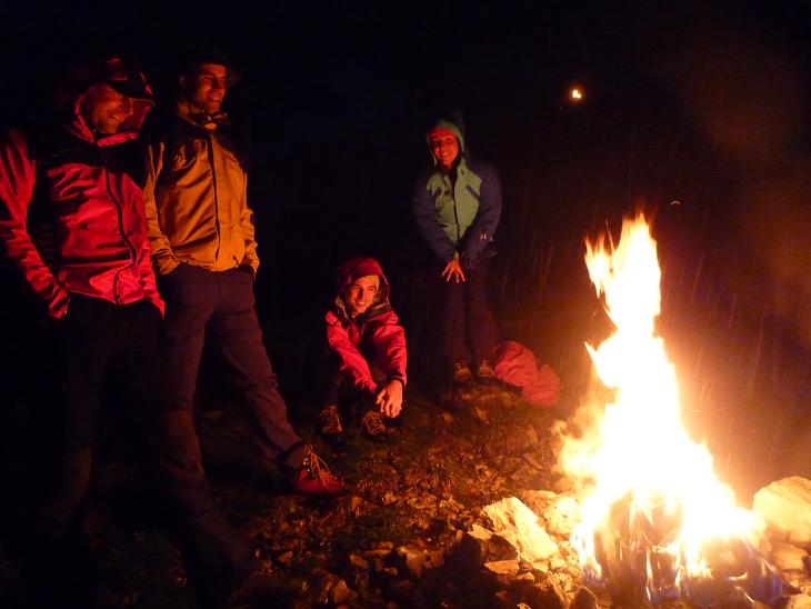 Wir erreichten die Hütte nach 1,5h ziemlich durchnässt und konnten uns mit einem Radler endlich auch innerlich befeuchten.“ Gabi&Robert servierten uns ein köstliches, viergängiges Menü, bevor wir bei mittlerweile leichtem Schneefall unsere Brikets packten und unweit der Hütte zwei Feuer entzündeten. Diese wurde immerhin von 6 weiteren Augenpaaren (davon gehörten“4 den Wirtsleuten…) gesehen – besser als nix!