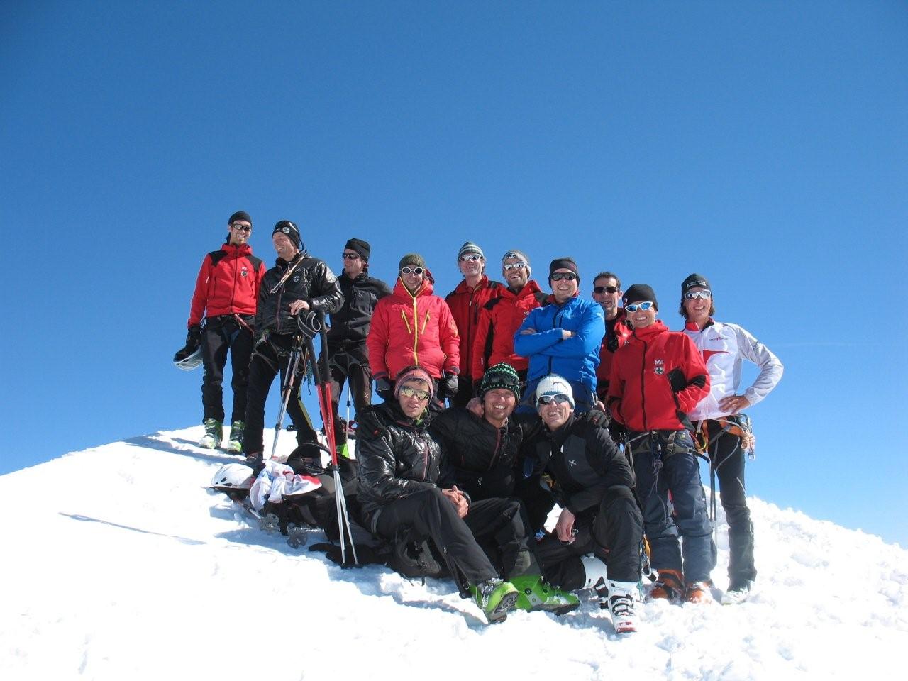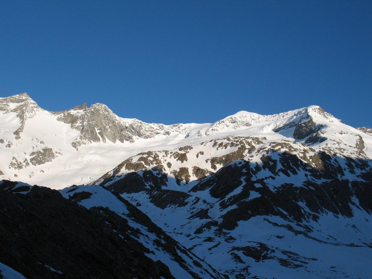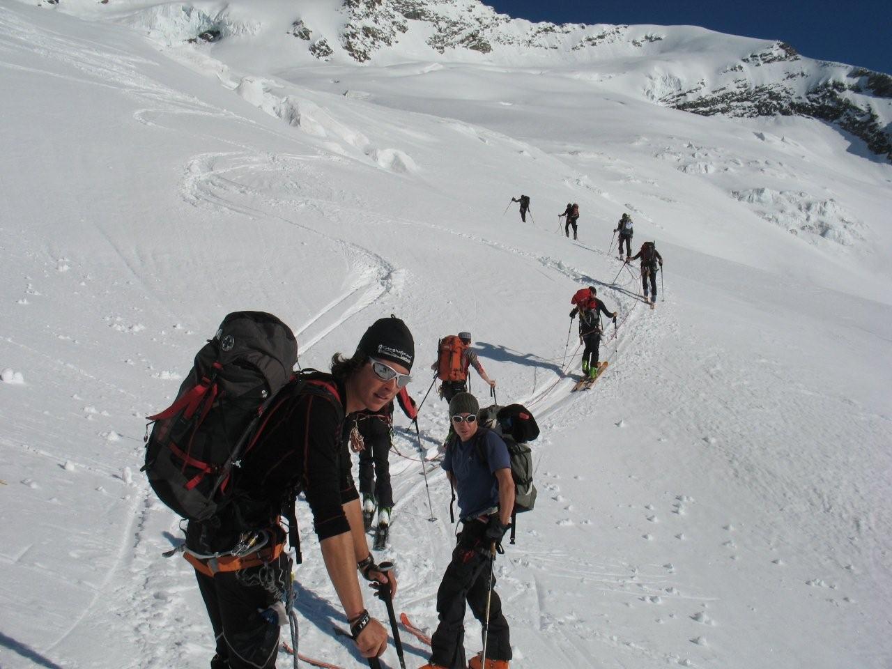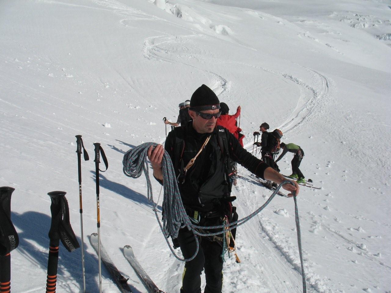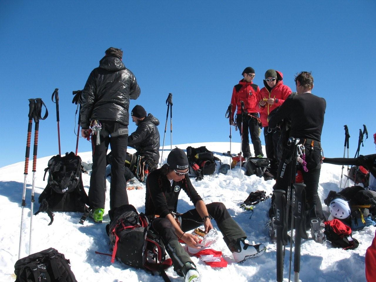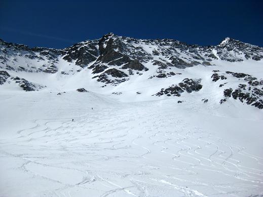 Sonntag 17.4. Motto des Tages: bloss nichts übertreiben.“Ein frostigen Start in den Tag. Die Aufstiegsspur war zum Teil glasiger als der Blick seiner Benutzer, was zu einem Zwischenfall mit glimpflichem Ausgang führte (obwohl der sich Richtung Gletscherbruch verabschiedende Schi heuer eh nicht mehr gebraucht wird). Mit ausgebrannten Kehlen (nein nicht des Alkoholkonsums wegen, sondern auf Grund der massiv einsetzenden Sonneneinstrahlung und der trockenen Luft) erreichten wir den Gipfel der westlichen Simonyspitze, der eine grandiose Fernsicht zwischen Marmolada und Bettelwurf bot. Abfahrt über Umbalkees und Reggentörl“in durchwegs vergnüglicher Schneekonsistenz zurück zur Hütte. Nach Erholung auf der Hüttenterrasse ging es wieder leichtfüßig (weil ohne Gepäck) zurück zum Parkplatz Ströden. „Dort mussten wir uns erst einmal Platz im Laderaum des Busses erkämpfen, da Gustl seine Liebe zur Geologie entdeckt hat und tonnenweise Steine eingeladen hatte. Nach Zwischenstopp bei einem Kebapstand in einem Tiroler Nobelschiort erreichten wir noch vor einbrechender Dunkelheit wohlbehalten Hall.