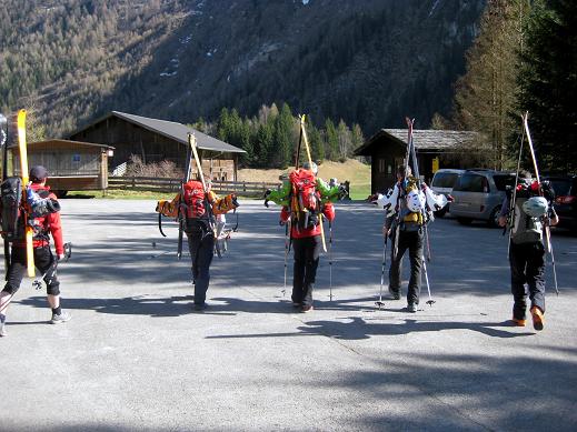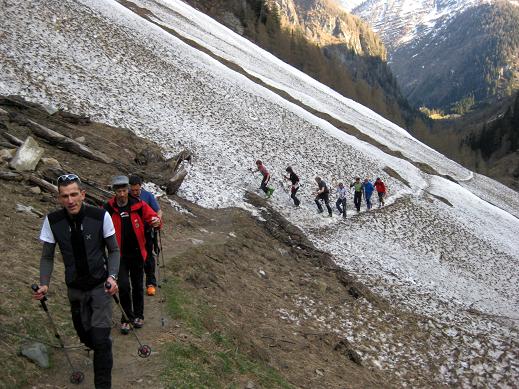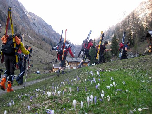 Samstag 16.4. Motto des Tages: langsam fahren, schnell gehen. Nachdem uns Gustl nach rekordverdächtigen drei Stunden Fahrzeit am Ende des Virgentales abgesetzt hatte, galt es zunächst einmal die Schier zu schultern. Der“Tragespass endete abrupt, da wir unser Material der Seilbahn zur Essen Rostocker Hütte überantworteten und gemütlich mit Turnschuhen weiter“marschierten (die Hardcoreabteilung ließ es sich nicht nehmen den Hüttenanstieg in Schischuhen zu bewältigen). Daraus erklärt sich auch die Anstiegszeit von nur ca. 1,5h – wie bei einer Sommerwanderung ohne Gepäck. Die Hütte liegt an einem genialen Platz, nämlich genau dort wo der Schnee beginnt. Das Abendessen wurde uns im leicht unterkühlten Hinterzimmer serviert, doch bald schon mischten wir uns zur Völkerverständigung unter das Volk in der gut temperierten Gaststube.