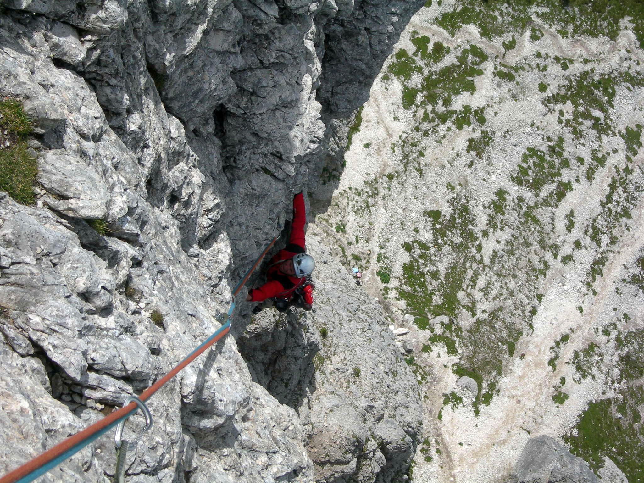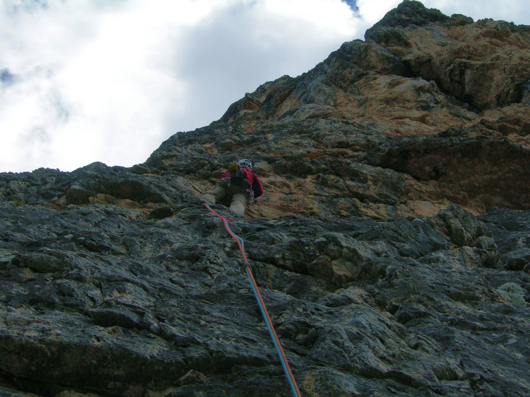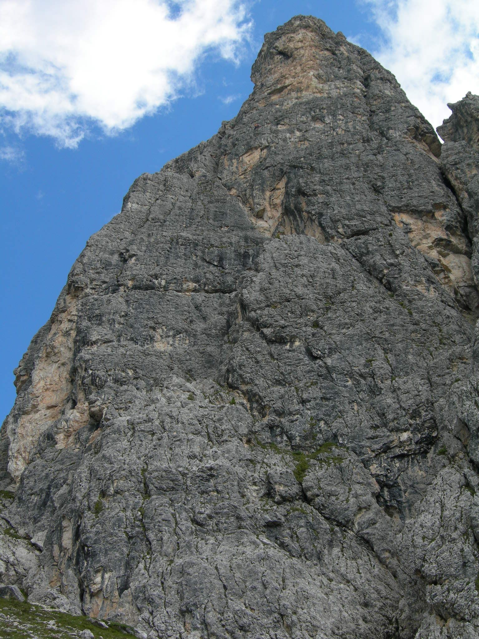 Der beabsichtigte Start am Sonntag musste wegen mangelnder Dichtheit am Hinternausgang um einen Tag verschoben werden. So fuhren wir am Montag zum Valparola Pass und kletterten an der Hexenstein SO Wand. „Berge in Flammen“ (6+) konnte aber trotz Führerlob bei uns keine Begeisterungsstürme entzünden, ebenso wenig wie ein Teller Suppe am Falzarego Pass für “ 8.- Bei wechselhaftem Wetter wechselten wir zum Passo Giau, wo wir nach kurzer Suche einen gemütlichen Lagerplatz fanden. Die erste Nachthälfte bestand ausnahmslos aus Regengüssen und Gewittern, aber wir hielten trotzdem an unserem Plan fest, morgen an einer (dann hoffentlich trockenen) Westwand zu klettern. „Nikibi“ (7+) am Torrione Marcella entschädigte für die wenig lohnende Kletterei vom Vortag “ schöne Linie an festem, steilem Fels bei guter Absicherung. Wer zu schwer für die Tour ist, kann sich an den vielen gebohrten Metallgriffen anhalten. Am Gipfel Panoramablick über Cortina zum Cristallo, Hohe Gaisl, Tofana, Marmolada et al. “ und leider alle Berge schon wieder in Wolkentürmen versteckt. Die Wettervorhersage für Mittwoch war bescheiden. Wenn es über Nacht wieder regnet und dann ab Mittag schon gewittert dann geht sich nicht einmal eine kurze Tour aus. Ein Bier später war klar, dass Arco wieder einmal als Notnagel herhalten muss, trotz der zu erwartenden Hitzeschlacht. Also nutzten wir das Wetter und fuhren etliche Kehren hinab in die norditalienischen Tropen. Um dem ärgsten zu entgehen begaben wir uns nach durchschwitzter Nacht bereits früh am Morgen auf einen „Ego Trip“ (7+): phantastische Platten- und Wandkletterei bei etwas viel Afrika. Die zahlreichen Bars und Cafes in Arco sind aber bestens für den Ansturm verdursteter Sportler gerüstet. Zisch.