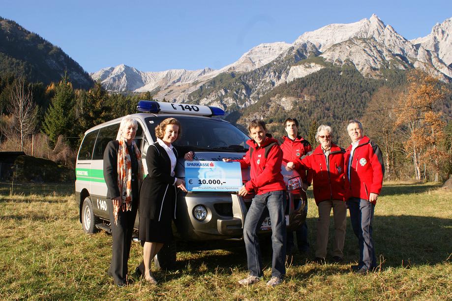 Im Rahmen einer kleinen Feier erfolgte die Übergabe der“ finanziellen Unterstützung“ durch die Privatstiftung der Tiroler Sparkasse Innsbruck Hall zum Ankauf eines Einsatzfahrzeuges“für unsere Ortsstelle. Überbracht wurde der Unterstützungsbetrag durch das Stiftungsratsmitglied Dr. Eva Posch und deren Assistentin Monika Ebenbichler.“ Der Erwerb des Fahrzeuges ermöglicht es“uns nun allradunterstützt zur Hilfe anfordernden Person vorzudringen und verletzte Personen in liegender Position abzutransportieren.“ Aus der Weitläufigkeit des Einsatzgebietes und der Vielfalt der Anforderungen, welche neben Versorgung, Bergung und Abtransport von in unwegsamem Gelände vermissten oder sonst in Not geratenen Personen und Tieren auch den Pistenrettungsdienst und die Liftevakuierung am Glungezer , die Stollenrettung im ehemaligen Salzbergwerk im Halltal sowie die Durchführung von Assistenzeinsätzen bei Sportveranstaltungen (z.B. Euro 2008) umfasst, ist die Notwendigkeit adäquater Transportmittel abzuleiten. Alleine im laufenden Jahr wurden wir“ von der Leitstelle Tirol zu 50 Einsätzen gerufen, bei denen“ 45 Personen betreut bzw. abtransportiert wurden .