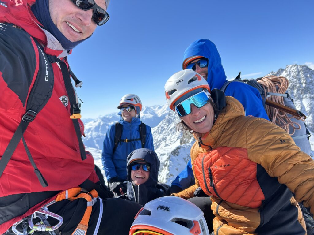 Am letzten Tag wurde der Sonnenschein von straffem Wind begleitet, was uns aber nicht davon abhielt, den inmitten der Gletscherwelt gelegenen Gletscherchamm über steile Flanken und einen kleinen Felsgrat zu besteigen. Die größte Herausforderung des Tages war dann allerdings der Weg durch das elendslange Verstanclatal hinaus zum Parkplatz Monbiel, wo entlang der Loipe jeder seine nordischen Fähigkeiten beweisen konnte.