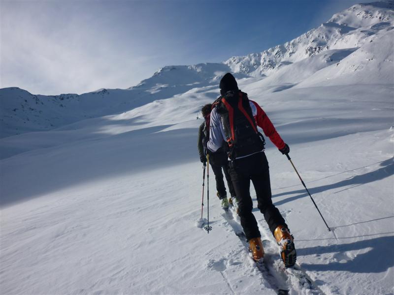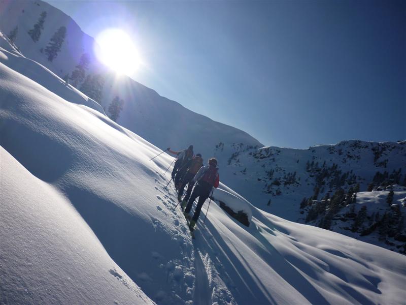 Für die erste Gemeinschaftstour suchten wir natürlich ein adäquates Ziel. Einen für alle Teilnehmer erreichbaren Gipfel, nicht überlaufen bei moderatem Gefahrenpotential. Nachdem die Lawinensituation als eher gespannt bezeichnet werden konnte, viel die Wahl auf mäßig steiles Gelände. Also starteten wir von der Eisbrücke im Sellraintal Richtung Roter Kogel, in älteren Führern also eine der schönsten Schitouren Tirols bezeichnet. Naja, wie das halt so ist mit den Superlativen. Letztendlich wurden es dann ca. 1800 Hm Aufstieg, ab dem Bergheim Fotsch in unberührtem Pulver mit wenig verdichteter Unterlage. Ein rundum gelungener Start in eine interessante Gemeinschaftstourensaison.““ -mac