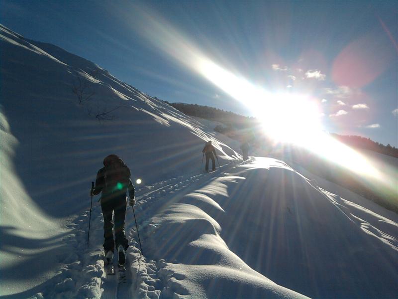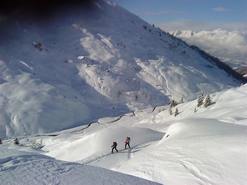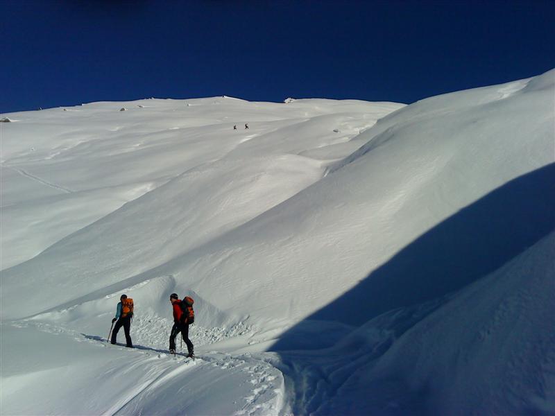 Am Gipfel hielten wir uns nicht lang auf, dazu wars zu kalt. Um den zweiten Aufstieg des Tages angehen zu können, mussten wir uns zurest die kalten, weißen Powderhänge ins Nurpenstal hinunterkämpfen “ welch Qual“ Unten konnten wir dann gottseidank wieder auffellen und stiegen noch zum Kleinen Gilfert auf, der uns mit eisigem Wind empfing “ also nichts wie weg hier. Diese endlosen Hänge verzögerten die Talankunft noch etwas, zudem waren sie leider (fast) völlig unverspurt 🙂